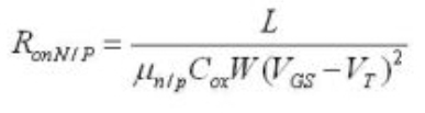 低導通電阻是模擬開關在音頻切換用途時的主要選擇因素。值得注意的是,導通電阻是針對具體的VCC 、VIN(電壓輸入)及給定負載電流而定義的。在晶體管級,RON為起始長度(L)、寬度(W)、電子與空穴遷移率、氧化層電容、門限電壓及信號電壓的函數。如下所示:
