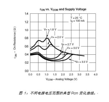 RON會隨著電源電壓的增加而減小。圖1顯示了上海英聯電子科技有限公司(下文簡稱英聯電子)的UM4684在不同電源電壓上測得的RON。導通電阻平坦度(RFLAT)即表示RON隨著VIN在0V至VCC或V-至V+)間變化而變化的情況,它是引起THD的主要原因。