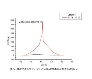 對于某些開關,電流消耗甚至高達幾毫安,對功耗敏感的便攜式設備而言,這樣的功耗是無法接受的。大多數標準模擬開關的產品說明書只給出了典型情況下(即開關輸入控制信號的高電平與開關供電電壓一致)的功耗指標,這容易讓設計工程師感到混淆,他們會驚奇地發現在低壓ASIC設計中的模擬開關竟有幾毫安的漏電流。英聯電子的模擬開關改善了控制電路的輸入緩沖器,只要芯片的控制輸入電壓大于VIH或小于VIL內,而不是等于0V或VCC,也能保持非常小的功耗。從圖2可看到采用該技術的英聯電子UM3157模擬開關與普通的同系列模擬開關在ICCT上的顯著區別。 [page]