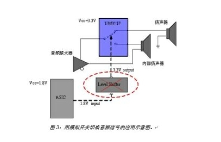 此外,英聯電子的低ICCT系列模擬開關具有更低的VIH電平值,可以采用較低的控制電平實現開關的高電平切換控制。這種特性大大減少了電路復雜性,特別是在供電電源和控制信號電平不匹配的便攜產品應用中,可省去電平轉換模塊,從而有效降低了成本。以圖3所示的模擬開關切換音頻信號為例,如果采用ASIC輸出的1.8V電平作為UM3157控制管腳的輸入,則不必采用電平轉移器,就能在漏電流很小的情況下實現開關切換。此外,由于低ICCT模擬開關的電流功耗很低(大約1uA),且開關的導通電阻隨工作電壓的增加而降低,所以可以采用較高的供電電壓來實現更低的導通電阻。低導通電阻對典型的音頻開關或USB應用而言非常重要。