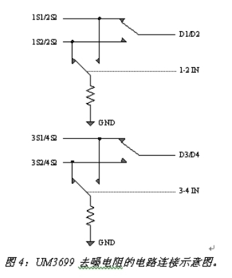 在音頻電路中,當模擬開關斷開時,由于寄生電容和電容失配,電容上的電荷無法釋放,從而導致耳機上的噪聲。可以通過在開關斷開時接通一個去噪電阻,來快速釋放電荷,從而提高音頻切換質量。圖4是英聯電子的UM3699在開關切換時去噪電阻的連接示意圖。
