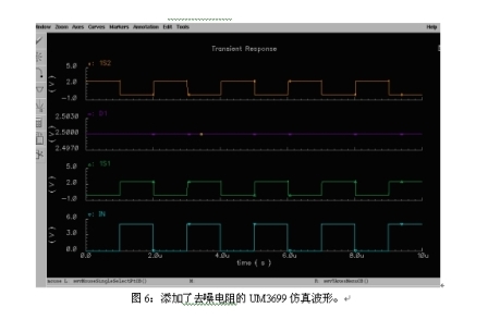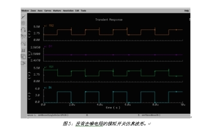 圖5是沒有采用去噪聲電阻時模擬開關的仿真波形圖。D1為輸入的數據信號。IN為選擇端信號。當IN為高電平時,開關通向1S1;當IN為低電平時,開關通向1S2。當開關斷開時,由于寄生電容和選擇端切換脈沖的存在,開關到地之間是高阻態,所以寄生電容的電荷沒有放電回路。這樣,開關的關斷端在較長的時間內將出現一個比輸入數據信號更高的電平,從而導致噪聲。圖6是采用圖4中的去噪電阻后開關切換的仿真波形圖。由于開關斷開后連接了去噪電阻上,形成一個對地的放電回路,所以寄生電容上的電荷得以很快釋放,從而消除了開關切換時的干擾電平,提高了開關在音頻切換應用時的聲音質量。