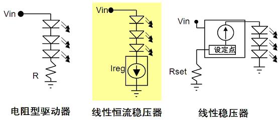 開關穩壓器的能效高,且提供極佳的亮度控制。線性穩壓器結構比較簡單,易于設計,提供穩流及過流保護,且沒有電磁兼容性(EMC)問題。