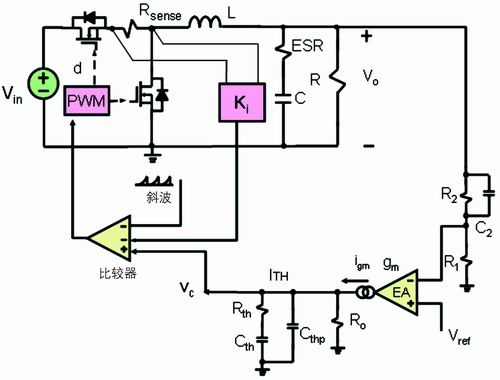 電流取樣電阻在輸入端的降壓轉(zhuǎn)換器如圖1所示。在電流模式的降壓轉(zhuǎn)換器拓樸結(jié)構(gòu)中,反饋有兩個(gè)環(huán)路:一個(gè)電壓外環(huán),另一個(gè)是電流內(nèi)環(huán)。電壓外環(huán)包括電壓誤差放大器、反饋電阻分壓器和反饋補(bǔ)償環(huán)節(jié)。電壓誤差放大器的同相端接一個(gè)參考電壓Vref,反饋電阻分壓器連接到電壓誤差放大器反相端VFB,反饋環(huán)節(jié)連接到VFB和電壓誤差放大器的輸出端VC。若電壓型放大器是跨導(dǎo)型放大器,則反饋環(huán)節(jié)連接到電壓誤差放大器的輸出端VITH和地。目前,在高頻DC/DC的應(yīng)用中,跨導(dǎo)型放大器應(yīng)用更多。本文就以跨導(dǎo)型放大器進(jìn)行討論。輸出電壓微小的變化反映到VFB引腳,VFB引腳電壓與參考電壓的差值被跨導(dǎo)型放大器放大,然后輸出,輸出值為VITH。跨導(dǎo)型放大器輸出連接到電流比較器的同相端,電流比較器的反相端輸入信號(hào)為電流檢測(cè)電阻的電壓信號(hào)VSENSE。由此可見,對(duì)于電流比較器,電壓外環(huán)的輸出信號(hào)作為電流內(nèi)環(huán)的給定信號(hào)。對(duì)于峰值電流模式,工作原理如下:在時(shí)鐘同步信號(hào)到來時(shí),高端的主開關(guān)管開通,電感激磁,電流線性上升,電流檢測(cè)電阻的電壓信號(hào)也線性上升。由于此時(shí)電壓外環(huán)的輸出電壓信號(hào)高于電流檢測(cè)電阻的電壓,電流比較器輸出為高電壓;當(dāng)電流檢測(cè)電阻的電壓信號(hào)繼續(xù)上升,直到等于電壓外環(huán)的輸出電壓信號(hào)時(shí),電流比較器輸出翻轉(zhuǎn),從高電平翻轉(zhuǎn)為低電平,邏輯控制電路工作,關(guān)斷高端主開關(guān)管的驅(qū)動(dòng)信號(hào),高端的主開關(guān)管關(guān)斷,此時(shí)電感開始去磁,電流線性下降,到下一個(gè)開關(guān)周期開始的時(shí)鐘同步信號(hào)到來,如此反復(fù)。
