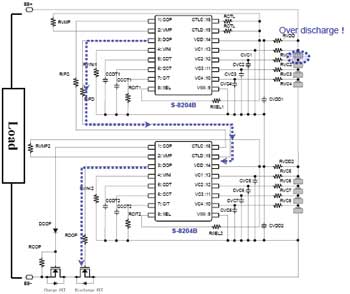 下面,詳細介紹一下保護芯片級聯(lián)的具體工作情況。還是以S-8204B為例,其CTLC端子可由芯片外部控制COP端子的輸出電壓、而CTLD端子則可由芯片外部控制DOP端子的輸出電壓。通過CTLC端子以及CTLD端子可以分別單獨控制COP端子與DOP端子的輸出電壓。并且,這些控制功能優(yōu)先于芯片內(nèi)部的電池充放電保護功能。如果8節(jié)電池中的某一節(jié)電池發(fā)生過充,與該電池相連接的S-8204B的COP端子輸出電壓會發(fā)生變化,該電壓變化會傳遞到與其相連接的另一個S-8204B的CTLC端子,使得另一個S-8204B的COP端子輸出電壓也發(fā)生變化,從而控制充電控制用MOSFET關(guān)斷,實現(xiàn)鋰離子電池的過充電保護。