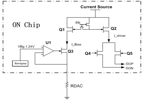 系統設計人員都知道,以太網收發器的輸出采用的是差分電流驅動,從收發器驅動偏置原理框圖,見圖5,可以進一步展開分析,收發器驅動電流可以通過帶隙電壓源與外部設定基準的比較來設定。收發器驅動電流(I_driver) 是從內部帶隙和外部基準鏡像過來。U1/Q3/RDAC/Bandgap組成了一個簡單的比較控制環路實現基準單位電流的設定,例如帶隙基準電壓設定為Vbg=1.24V,RDAC取值為1.24K。這時通過比較器U1以及MOS管Q3反饋環路是確保穩定1mA(I_bias)的基準電流。而Q1/Q2/Current _Source組成了比例鏡像電流源。可以通過設計保證I_driver=N*I_bias,N是設定的比例鏡像因子。我們假定為20,通過公式可以計算I_driver=20*I_bias=20mA,這就是我們差分驅動的輸出電流了。介紹到這里,大家都應該清楚了,我們可以通過調整RDAC的電阻大小實現基準單位電流的設定,進而達到調整差分驅動電流的目的。例如我們將RDAC調整為1K,則基準單位電流則變為I_Bias=1.24mA,同步的I_driver變為20*1.24mA=24.8mA,輸出信號電平的幅度也會增大。實際的調測結果也是這樣,可以解決信號邊沿碰觸模板的問題。