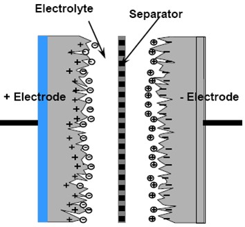 超級電容器可以被視為在兩個極板外加電壓時被電解液隔開的兩個互不相關的多孔板。對正極板施加的電勢吸引電解液中的負離子,而負面板電勢吸引正離子。這有效地創(chuàng)建了兩個電荷儲層,在正極板分離出一層,并在負極板分離出另外一層。
