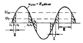 當輸入端未加電壓信號時,光耦合器的光敏晶體管因未接收光而截止,V1飽和,V3和V4因無觸發電壓而截止,此時SSR關閉。當加入輸入信號時,光耦合器中的發光二極管發光,光敏晶體管飽和,使V1截止。此時若V3兩端電壓在-(10~25)V或10~25V范圍內時,只要適當選擇分壓電阻R4和R5,就可使V2截止,這樣使V3觸發導通,從而使V4的控制極上得到從R6→UR→V3→UR→R7或反方向的觸發脈沖,而使V4導通,使負載接通交流電源。而若交流電壓波形在圖2中的Ⅲ區內時,則因V2飽和而抑制V3和V4的導通,而使SSR被抑制,從而實現了過零觸發控制。由于10~25V幅值與電源電壓幅值相比可近似看作“零”。因此,一般就將過零電壓粗略地定義為0~±25V,即認為在此區域內,只要加入輸入信號,過零觸發型AC—SSR都能導通。