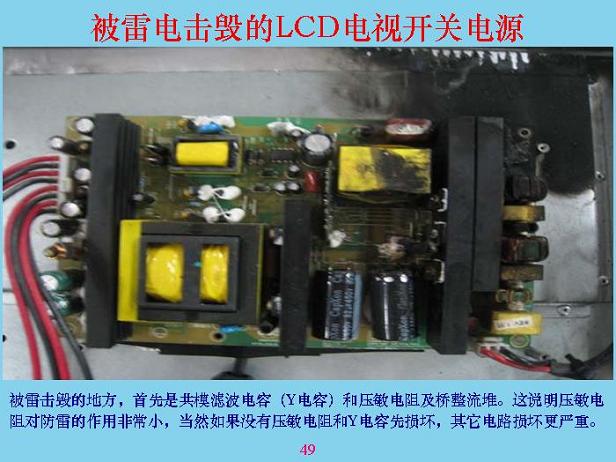 下面我們講一些具體的。這是一個開關電源,開關電源被雷劈的時候,輸入回路基本上都燒了,假如沒燒是什么樣的?可以看看,這是橋堆,這兩個是Y電容,這里面還有一個壓敏電阻。這是共模線圈,雷劈以后全部燒了,說明壓敏電阻沒有起到什么保護作用,兩個電容都燒了,說明電感相當、相當地高。為了防止雷電,首先前面一定要加一個能量吸收,比較大的東西,成本相對來說比較低,像試驗站里面的放電裝置,那個東西沒有地方裝,也貴得很。在硬紙板上面排幾個鋸齒,中間隔一個頭就行了。如果中間隔6mm也可以。有一個一級電感,電感可以使瞬間上去很快的電壓降下來,突然加一個1萬伏、10萬伏,加上去只有這兩端,另外兩端建立不起來,所以剛加進去的時候對雷電來說,大部分能量都被吸收掉了。后面經過這個以后,剩余部分通過共膜電容繼續吸收,吸收完以后還有差模部分,產生的差模部分通過電容把差模吸收掉。共模電容和差模電容具有抑制傳導干擾的作用,對雷電也有抑制作用,所以很多人也在問,電容接到前面好還是接在后面好?這個東西看你有什么作用,如果只是為了防EMI電磁干擾的話,接在越前面越好,接在測試儀表的輸入端最好,接到那里把信號全部短路掉了,就看不到了。但是對于雷電,你接到后面要好很多,所以這主要是防雷的,你就不要考慮電磁干擾和EMC了,盡量把兩個放在后面。