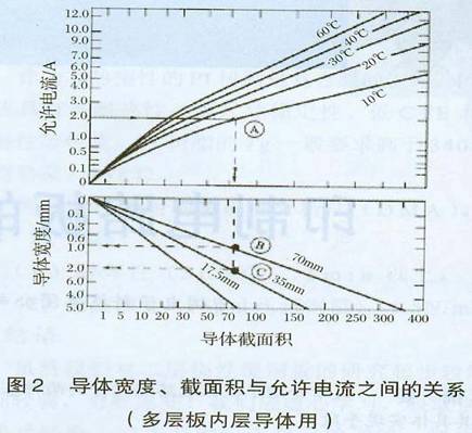 值得注意的是,當導體圖形溫度上升到85℃左右時,絕緣材料自身開始發黃(圖1),電流繼續通過,最后銅圖形熔斷,特別是多層板內層圖形,周圍都是傳熱性差的樹脂,散熱困難,因而溫度不可避免地上升,所以特別要注意導體圖形線寬的設計。實際上在進行PCB布線設計時走線線寬主要依據其發熱量和散熱環境來確定的。銅導體的截面積決定了導線電阻(數字電路中線電阻引起的信號損耗可忽略不計),銅導體和絕緣基材的導熱率影響溫升,進而決定載流量。圖2是普通FR-4覆銅箔板銅導體圖形線寬及截面積與允許電流之間的關系圖。從圖中可以看出:導體圖形截面積一定,當其允許電流值為2A,溫度上升值低于10℃時,對于35Um銅箔,其線寬應設計為2mm:對于70um銅箔,其線寬應設計為lmm。由此得出:當導體的截面積、允許電流和溫度上升值一定時,可通過增加銅箔厚度或加大線寬值兩個方面來滿足走線的散熱要求。