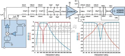 AD8376的電流輸出型電路具有高輸出阻抗,因此其差分輸出需要接150 Ω電阻實現電壓輸出。另一個差分濾波器放置在AD8376和ADC之間,用于衰減二階和三階諧波失真成分,因此該150 Ω負載可以被分成兩部分。首先將300 Ω電阻安裝于AD8376的輸出端。另一個300 Ω電阻由兩個165 Ω電阻和ADC的3 kΩ輸入阻抗構成。兩個165 Ω電阻同時為ADC輸入提供直流共模電壓。LC濾波器的輸入和輸出阻抗均為300 Ω。對于高中頻應用,信號源和負載的阻抗的完美匹配是非常重要的。完整接口如圖4所示。