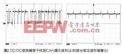 FCEV用DC/DC變換器的功率一般比較大,通常選擇IGBT為功率開關管。功率開關管IGBT工作過程中產生高的du/dt和di/dt以及浪涌電流和尖峰電壓[1],這是FCEV用大功率DC/DC變換器產生電磁干擾最根本的原因。另外功率開關管開通和關斷瞬間,由于分布電感和分布電容的存在,電感電流容易發生高頻振蕩,這些因素都會產生強大的電磁干擾,這在FCEV用大功率DC/DC變換器中表現的尤為明顯。這種電磁干擾嚴重影響整車控制器與CAN通信,導致CAN通訊頻繁報錯,無法正常通訊。CAN通訊受干擾后的傳輸波形如圖2(a)所示。從圖中可以明顯看到,變換器開關噪音疊加在CAN通訊脈沖上,并且幅度很大。此外,嚴重的電磁干擾也會使大功率DC/DC變換器輸出紋波過大,紋波過大直接影響大功率DC/DC變換器的性能[2]。圖2(b)是用示波器采集到的變換器未經濾波處理的輸出電壓波形,從圖中可以看到,輸出電壓上疊加了大量的開關噪音。