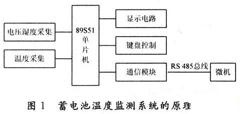 蓄電池溫度監(jiān)測系統(tǒng)的原理框圖如圖1所示。主要由電壓、溫濕度采集、溫度采集、89S51單片機、鍵盤控制模塊、顯示電路模塊、通信模塊組成。該系統(tǒng)能完成6組或6組以上通信電池的溫度測量、1路機房環(huán)境測量(溫度、濕度測量)、2路直流電壓和2路交流電壓測量,傳輸數(shù)據(jù)距離大于200m。