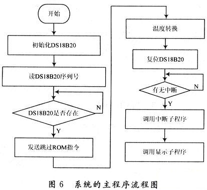 蓄電池溫度監(jiān)測系統(tǒng)的軟件設(shè)計主要包括主程序、外部中斷子程序、顯示子程序等。圖6是該系統(tǒng)的主程序流程圖。用于完成對DS18B20的調(diào)用、中斷管理、測量溫度值的計算及溫度值的顯示等功能。主機89S51首先復(fù)位脈沖使信號線上所有的DS18B20芯片都被復(fù)位,接著發(fā)送跳過ROM操作命令,激活在線的所有DS18B20,然后系統(tǒng)轉(zhuǎn)人中斷處理流程,完成溫度轉(zhuǎn)換,讀取等工作。外部中斷子程序完成對溫度測量數(shù)據(jù)的讀取,顯示子程序完成液晶顯示器的初始化及顯示溫度值。