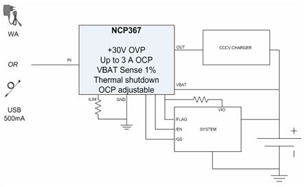 以NCP367為例,這是一款提供+30 V過壓保護及高達3 A過流保護、帶電池電壓檢測功能的保護IC(見圖5)。這器件保護便攜設備電池免受輸入過壓(在出現故障工作條件下會斷開系統與Vbus或AC-DC適配器的連接)、充電過流及充電過壓影響。NCP367提供最大值100 mΩ的低導通阻抗,幫助降低方案成本及電路板占用空間。支持高達3 A電流的能力幫助實現快速充電。典型值50 μA的極低電流消耗兼容于USB 500 μA閑置模式。這器件能用于1.5 A或500 mA兩種充電電流等級,非常適合手機等應用。