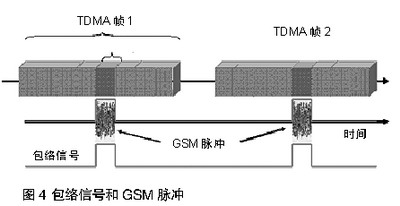 特定的手機只在屬于它的時間空當發射。包絡信號的基本頻率是1/4.615 ms=217Hz。諧波頻率為434Hz、651Hz等。如此頻率是聽得到的。如圖4所示,為手機的包絡信號。