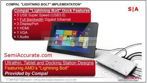 Lightning Bolt由三部分組成,分別是線纜、特殊的底座及筆記本之類的終端,聽起來很復雜,但其實Lightning Bolt使用的也是標準的DP接口,理論上甚至能支持雷電接口。雖然只有一條DP通道,但是用它就可以連接Eyefinity多屏輸出以及5個USB 3.0接口,這也是Lightning Bolt接口在平板及超級本這樣缺少空間提供又大量接口的設備上存在的意義。