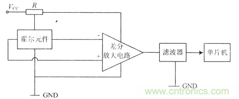 本系統(tǒng)中的第一部分由圖3中的霍爾傳感器裝置提供,由霍爾元件(A44E)、差分放大器和濾波器組成。其輸出電壓與霍爾元件位移成比例,具有較高靈敏度,能夠產(chǎn)生出符合要求的電壓信號。