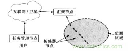 典型的無線傳感器網絡結構如圖1。在監測區域內布置大量傳感器節點,節點間采用自組織方式進行組網以及利用無線通信技術進行數據轉發,每個節點都具有數據采集與數據融合轉發雙重功能。節點對本身采集到的信息和其它節點轉發給它的信息進行初步的數據處理和信息融合之后以相鄰節點接力傳送的方式傳送到基站,然后通過基站以互聯網、衛星等方式傳送給最終用戶。