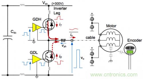 三相逆變器是一種功率電子開關電路,控制功率從直流供電軌到三個交流電機繞組的流動。逆變器有三條相同的腿,每條腿包括兩個IGBT晶體管和兩個二極管,如圖1所示。每個電機繞組均連接至通過分流器連接高端晶體管和低端晶體管的同一節點。逆變器使電機繞組在直流總線的高壓軌和低壓軌之間切換,以控制平均電壓。繞組具有極高的電感性,將阻擋電流的變化,因此,當功率晶體管關閉時,電流將開始在連接至相反電源軌的二極管中流動。這樣,即使逆變器功率設備和直流鏈路電容中存在斷續傳導,也會有電流連續流到電機繞組中。電機繞組阻抗充當來自逆變器的高壓脈沖寬度調制方波輸出電壓的低通濾波器。將低壓控制電流連接至逆變器時存在巨大的困難。一個基本問題是,高端晶體管發射器節點在高壓總線高供電軌與低供電軌之間切換。首先,高端驅動器必須能夠驅動相對于一個發射器(可能比共用輸入信號高300 V或以上)的柵極信號。其次,通過分流器(vsh)的電機電流信號必須從300 V或以上的共模電壓中提取出來。其他問題將由電源電路中的寄生元件導致。當功率晶體管或二極管的開關頻率超過1 A/ns時,即使是10 nH的PCB走線電感也可能導致顯著的電壓(>10 V)。寄生電感和部件電感會導致振鈴,結果使設備開關產生的噪聲脈沖的持續時間變長。甚至電機電纜的高頻阻抗也可能帶來問題,因為出于安全考慮,配電板可能離電機很遠。其他效應包括噪聲從電機耦合到反饋傳感器信號中,其原因是快速切換的繞組電壓波形。問題將變得更加嚴重,因為驅動電路的功率額定值將增加電路板的物理尺寸,結果將進一步增加寄生電感,甚至提高電流和電壓開關速率。