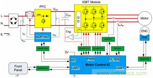 展示了柵極驅動、通信和反饋信號隔離的典型驅動電路如圖4所示。在該系統中,隔離的Σ-Δ ADC用來測量電機繞組電流,數字位流則由電機控制IC上的數字過濾電路進行處理。位置編碼器包含一個ASIC,由其通過一個隔離式RS-485接口將位置和速度數據發送給電機控制IC。其他隔離式串行接口包括連接PFC的I2C接口以及連接前面板的隔離式RS-232鏈路。在此例中,PWM信號與逆變器模塊隔離,IGBT由一個嵌入該模塊中的電平轉換柵極驅動器驅動。