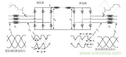 由于晶閘管只能接通,不能斷開,因此交流電壓會使晶閘管發生反向偏置并停止傳導。因此,LCC中的晶閘管的偏置取決于電網AC側用于換流的功率。在晶閘管正向偏置后導通時的延時決定了相位角延遲(觸發角)。晶閘管的相位角延遲實現了交流波的相位角控制。