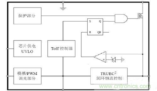 所謂開環(huán),不以檢測(cè)到的輸出電流值來(lái)做發(fā)出PWM信號(hào)的參考。所謂的閉環(huán),即真正檢測(cè)輸出電流值,以此為標(biāo)準(zhǔn)來(lái)發(fā)出PWM信號(hào)。從電路拓?fù)渖希邲]有區(qū)別。但是在芯片內(nèi)部對(duì)檢測(cè)到的如圖1 CS腳電感電流信號(hào),做專利技術(shù)處理,如圖2 TRUEC2部分。這樣,就檢測(cè)到了電感電流的平均值,也就是輸出電流的平均值。芯片針對(duì)檢測(cè)到的值,控制輸出占空比,實(shí)現(xiàn)了閉環(huán)控制。
