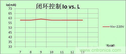 圖4可見,線性調(diào)整率為0,因?yàn)槿]環(huán)控制逐周期精確控制,輸入有任何變化,芯片會(huì)馬上檢測(cè)到并作相關(guān)的調(diào)整以便得到同樣的輸出;同理,如圖5及圖6,當(dāng)輸出電壓變化,電感量變化時(shí),芯片也會(huì)作相關(guān)的調(diào)整;正是因?yàn)槲覀兊娜]環(huán)高精度恒流控制方法,使電源做到了真正的恒流。這樣,量產(chǎn)的一致性可以控制到小于±1%.