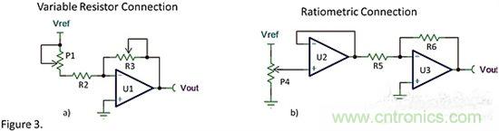圖3b中引入了運算放大器U2,使得電位器工作在比例模式,從而可以消除圖3a中的缺陷。運算放大器U2提供了高的輸入阻抗從而減小了接觸電阻的影響。隨著電位器位置的變動,運算放大器U2的輸出電壓從0V到Vref之間精確變化。給運算放大器U3提供一個精確的電壓范圍,從而只需給R5、R6設定一個固定的阻值,而且不需要對電路進行增益調節。
