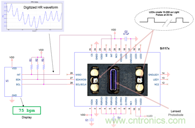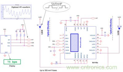 圖3. 一個只需要外部LED的集成化心率傳感器