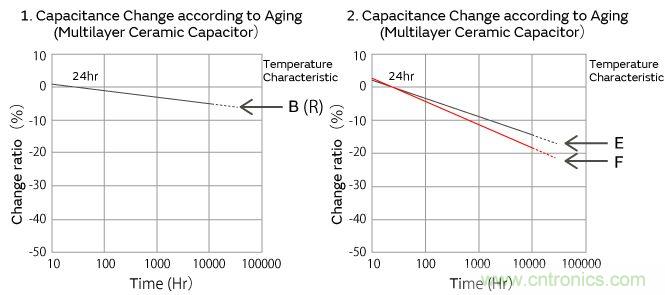 高誘電系的積層陶瓷電容器的靜電容量,以經過125℃以上的熱處理24小時后的值作為基準,與時間成對數關系直線性下降。請參考如下村田制品靜電容量老化特性的代表例子。