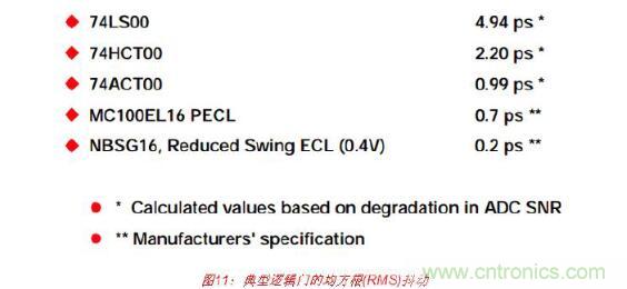 為了顯示這些抖動值的重要性,請考慮與一組邏輯門相關的均方根(RMS)抖動典型值,如 圖11所示。74LS00、74HCT00和74ACT00的值都是采用參考文獻1第5章所述的方法以高 性能ADC(孔徑抖動小于0.2-ps rms)測得的,其中抖動是從因多個相同門串聯而導致的FFT SNR降低計算得出的。然后,通過除以串聯門總數的平方根,便可計算出單個門所造成 的抖動。制造商給出了MC100EL16和NBSG16的抖動數據。