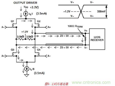 當并行數據速率超過約100 MSPS時,由于不太可能會產生CMOS邏輯電平以上的瞬變干 擾,因此通常使用低電平電流模式差分邏輯(PECL、較低級別的PECL或LVDS等)(見圖 9)。這樣可幫助最大程度地減少因碼相關毛刺而產生的失真。例如,AD9734/AD9735/ AD9736 DAC系列采用1.2 GSPS并接受LVDS輸入邏輯電平。片上包含特殊電路,以確保 輸入數據相對于DAC時鐘具有正確時序