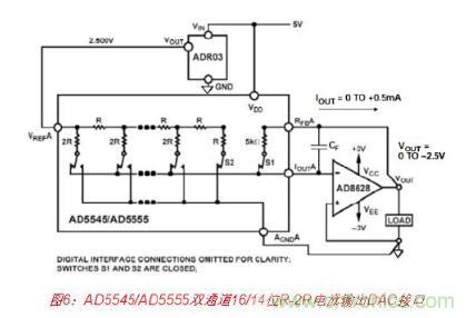 基于R-2R的電流輸出DAC的輸出阻抗與碼字有關,因此其輸出必須驅動運算放大器的虛 擬地,以便維持線性。16/14位DAC AD5545/AD5555都是此種架構的很好范例。圖6所示為 一種合適的接口電路,其中ADR03用作2.5 V基準電壓源,而AD8628斬波穩定運算放大器 用作輸出I/V轉換器。