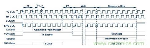 來(lái)自處理器的時(shí)鐘信號(hào)是連續(xù)的,而EnDat協(xié)議規(guī)定,時(shí)鐘只能在通信期間施加于編碼器。在所有其他時(shí)候,時(shí)鐘線路必須保持高電平。為此,處理器產(chǎn)生一個(gè)時(shí)鐘使能信號(hào)CLK EN,其被送至ADM3065E數(shù)據(jù)使能引腳。恰好兩個(gè)時(shí)鐘周期(2T)之后,主機(jī)開始在Tx DATA上發(fā)出命令。