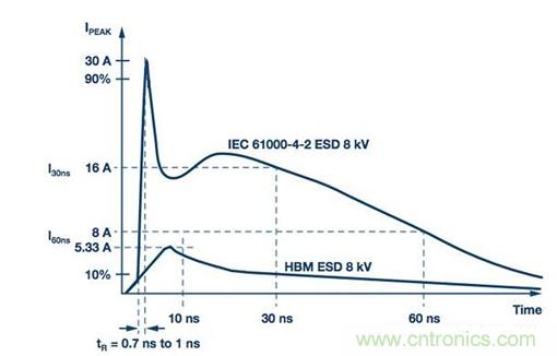圖3. IEC 61000-4-2 ESD波形(8 kV)與HBM ESD波形(8 kV)的對(duì)比