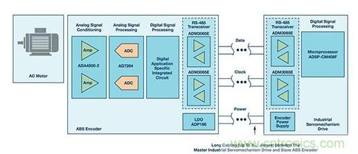 【導(dǎo)讀】旋轉(zhuǎn)編碼器廣泛用于工業(yè)自動(dòng)化系統(tǒng)中。此類編碼器的典型應(yīng)用是電力機(jī)械,其中編碼器連接到旋轉(zhuǎn)軸,從而向控制系統(tǒng)提供反饋。雖然編碼器的主要用途是角度位置和速度測(cè)量,但系統(tǒng)診斷和參數(shù)配置等其他特性也很常見。圖1顯示了一個(gè)電機(jī)控制信號(hào)鏈,其利用RS-485收發(fā)器和微處理器連接絕對(duì)編碼器(ABS編碼器)從機(jī)和工業(yè)伺服驅(qū)動(dòng)器主機(jī),以實(shí)現(xiàn)對(duì)交流電機(jī)的閉環(huán)控制。