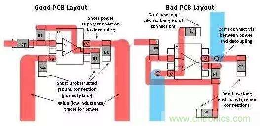 除了使用去耦電容器外,您還要在去耦電容器、電源和接地端之間采取較短的低阻抗連接。圖3將良好的去耦合板面布局與糟糕的布局進(jìn)行了對比。您應(yīng)始終嘗試著讓去耦合連接保持較短的距離,同時(shí)避免在去耦合路徑中出現(xiàn)通孔,原因是通孔會增加電感。大部分產(chǎn)品說明書都會給出去耦合電容器的推薦值。如果沒有給出,則可以使用0.1uF。