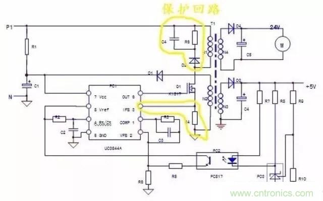 3)保護(hù)回路:PC1芯片本身和3腳外圍元件R4構(gòu)成過電流保護(hù)回路;N1繞組上并聯(lián)的D2,R6,C4元件構(gòu)成了開關(guān)管的反壓吸收保護(hù)電路;實(shí)質(zhì)上穩(wěn)壓回路的電壓反饋信號——穩(wěn)壓信號,也可看作一路電壓保護(hù)信號,但保護(hù)電路的內(nèi)容并不僅是局限于保護(hù)電路本身,保護(hù)電路的啟控往往是由于負(fù)載電路異常所引起的。