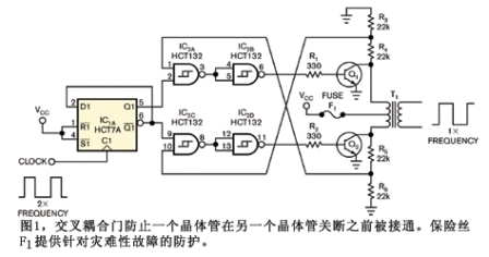 交疊是推挽驅動器的兩個晶體管同時處于導通狀態的短暫時間。在中心抽頭變壓器的初級中,這是常見的問題。交疊導致很大的電流尖峰和更多的開關損耗。飽和的晶體管關斷速度慢于接通速度,導致了這個問題。防止交疊的一種方法是在關斷一個晶體管之后并在接通另一個晶體管之前提供延時。該方法需要幾個額外元件,并且必須為最壞情形包含足夠長的延時。本設計實例利用交叉耦合門來防止晶體管在另一個晶體管關斷之前被接通(圖1)。為簡化起見,該圖并未描繪旁路電容器、緩沖器網絡和其它無需用來描繪該方法的元件。