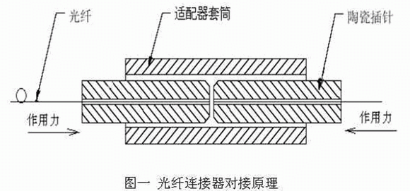 光纖連接器不能單獨使用,它必須與其它同類型的連接器互配,才能形成光通路的連接,目前,較為流行的光纖連接器裝配和對接方式為:利用環氧樹脂熱固化劑,將光纖粘固在高精度的陶瓷插針孔內,然后使兩插針在外力的作用下,通過適配器套筒的定位,實現光纖之間的對接(如圖一)。