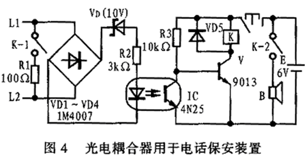 為了防止電話線路被并機竊用或電話機被盜用通話,可以利用光電耦合器來設計一個簡單實用的電話保安電路,其實隔電路如圖4所示。圖中,由VD1~VD4組成極性轉換電路。由于在將本保安器接入電話線路中時,不需要分清電話線路反饋電壓的極性,因此,使用該保安器可以給安裝帶來很大的方便。