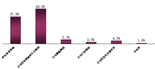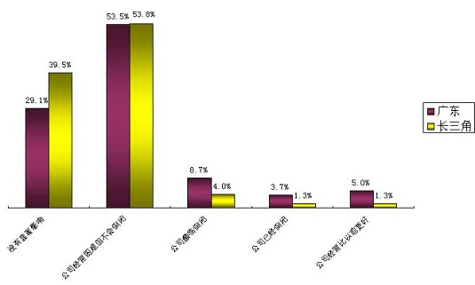 此項調查結果出乎我們的意料,選擇裁員的企業已經占到了20.8%,但是多數企業還是選擇了調整經營策略。我們特別希望有遠見的企業不要把裁員作為應對危機的主要措施,這也不符合我們“和諧社會”的主旋律。只要能正確的面對,認真分析企業的優勢,研究市場的動向,合理配置企業資源,充分發揮員工的潛力,調動員工的積極性,企業一定會有新的轉機。企業如能和員工共克時艱,就會加深員工對企業的感情,這種情感會轉化為企業的一種優勢資源。(見圖表四)