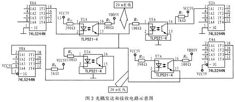 在長線傳輸中,正是因為地線的交流阻抗特性,使得地線成了電路中事實上的最大噪聲源。地線造成干擾的主要原因是地線存在阻抗,當(dāng)電流流過地線時,會在地線上產(chǎn)生電壓,這就是地線噪聲。在這個電壓的驅(qū)動下,會產(chǎn)生地線環(huán)路電流,形成地環(huán)路干擾。南于發(fā)送和接收設(shè)備共用一段地線,會形成公共阻抗耦合。采用光電隔離器TLP521-4對發(fā)送和接收設(shè)備進(jìn)行電氣隔離,對于減小交流阻抗的作用十分明顯,進(jìn)而增大傳輸電流,有效地抑制地線噪聲;同時由于74LS244N的應(yīng)用。總線驅(qū)動能力得到保障。圖2為光耦發(fā)送和接收電路示意圖。圖2中,上半部兩光耦自左向右傳輸信號,下半部兩光耦自右向左傳輸信號,左端74LS244N通過靜態(tài)存儲器IDT7132與處理器進(jìn)行數(shù)據(jù)交換,右端通過8255與處理器進(jìn)行數(shù)據(jù)交換。
