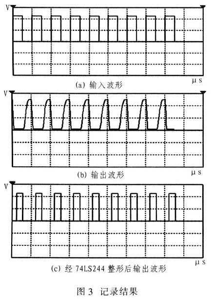 調(diào)試中,輸入周期為100μs,占空比為1/2的+5V方波,對一路光耦的輸入端波形和經(jīng)過20m長線后接收光耦的輸出端波形以及經(jīng)過74LS244整形后的波形進(jìn)行記錄。記錄結(jié)果如圖3所示。