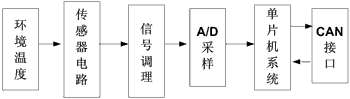該溫度檢測節點由傳感器電路、信號調理電路、單片機應用系統、CAN總線接口等構成。電路基本工作原理是:傳感器電路將感應到的溫度信號以電壓的形式輸出到信號調理電路,信號經過調理后輸入到A/D采樣電路,由ADC將數字量值送給單片機系統。單片機系統將監控實時溫度,當溫度超過警戒值和危險值時,單片機將主動發送警告信息到上位機,提醒操作人員檢查。模塊邏輯結構如圖1所示。