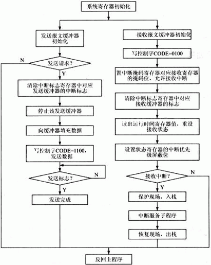 各控制器應按規(guī)定格式和周期發(fā)送數據到總線上,同時也要接受其他控制器的信息。總線上的其他控制器則根據需要各取所需的報文。對于接收數據,本系統(tǒng)采用中斷方式實現。一旦中斷發(fā)生,即將接收的數據自動裝載到相應的報文寄存器中,此時還可采用屏蔽濾波方式,利用屏蔽濾波寄存器對接收報文的標識符和預先在接收緩沖器初始化時設定的標識符進行有選擇地逐位比較,只有標識符匹配的報文才能進入接收緩沖器,那些不符合要求的報文則將被屏蔽于接收緩沖器之外,從而減輕CPU處理報文的負擔。此外,不同數據應放入不同的報文寄存器中,因此在接收中斷服務程序中,就可以容易地判斷出中斷是由哪個接收報文引起的,其程序流程圖如圖3所示。