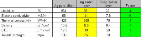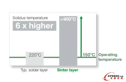 如果有人要考慮燒結層的厚度,燒結層的厚度比標準焊接層薄4.5倍,導熱系數大4倍。這使得燒結連接具有良好的熱性能。燒結層也表現出遠高于焊接層的循環能力。這就得到一個事實,即燒結連接中所用銀的熔點比今天普遍使用的無鉛焊料要高出4倍(見表1)。燒結技術高溫穩定性表明連接層沒有老化。