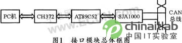 本文所介紹的USB-CAN轉(zhuǎn)接技術總體框圖如圖1所示,該設計分兩大部分:一是與主機USB接口相連的USB控制部分;二是與CAN總線相連的CAN控制器部分。兩者中間通過單片機聯(lián)系起來。USB控制部分用USB接口控制芯片CH372來實現(xiàn)數(shù)據(jù)的接收和發(fā)送;CAN控制器SJA1000用來實現(xiàn)CAN總線間的數(shù)據(jù)通信。單片機用來進行相應的控制、協(xié)調(diào)以及系統(tǒng)的通信。