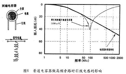 我們平常使用的陶瓷圓片電容器作為旁路電容,可以將高頻干擾短路到地,達到抗干擾的目的。但是電容器的引線電感及電容內(nèi)部的剩余電感卻限制了它的高頻特性發(fā)揮。圖6是普通電容器做高頻旁路時的引線電感影響例。